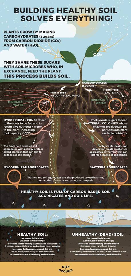Ryland Englehart, co-founder of Kiss the Ground, a non-profit in LA, shares that between carbon extraction via fossil fuels and our agriculture practices, “We’ve moved 880 giga-tons [880,000,000,000 tons] of carbon dioxide into the atmosphere which is heating up the planet and destabilizing our climate. Now, the oceans have absorbed a lot of this excess carbon which is resulting in ocean acidification and accelerating a mass extinction of sea life… Where do we put this excess carbon to get this cycle back into balance? The answer is literally… under our feet. It’s the soil.”