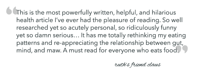 Ruth blogs about her passion for food & healing, her curiosities and her whole self, which tends to be anything that’s uncool to bring up at parties: gardening, periods, mental illness, poverty, injury, sex therapy, codependence, healthy eating, poop, avocado tree hoarding, feelings in general, and honesty. She hasn’t actually blogged about periods yet, but does always bring it up at parties.